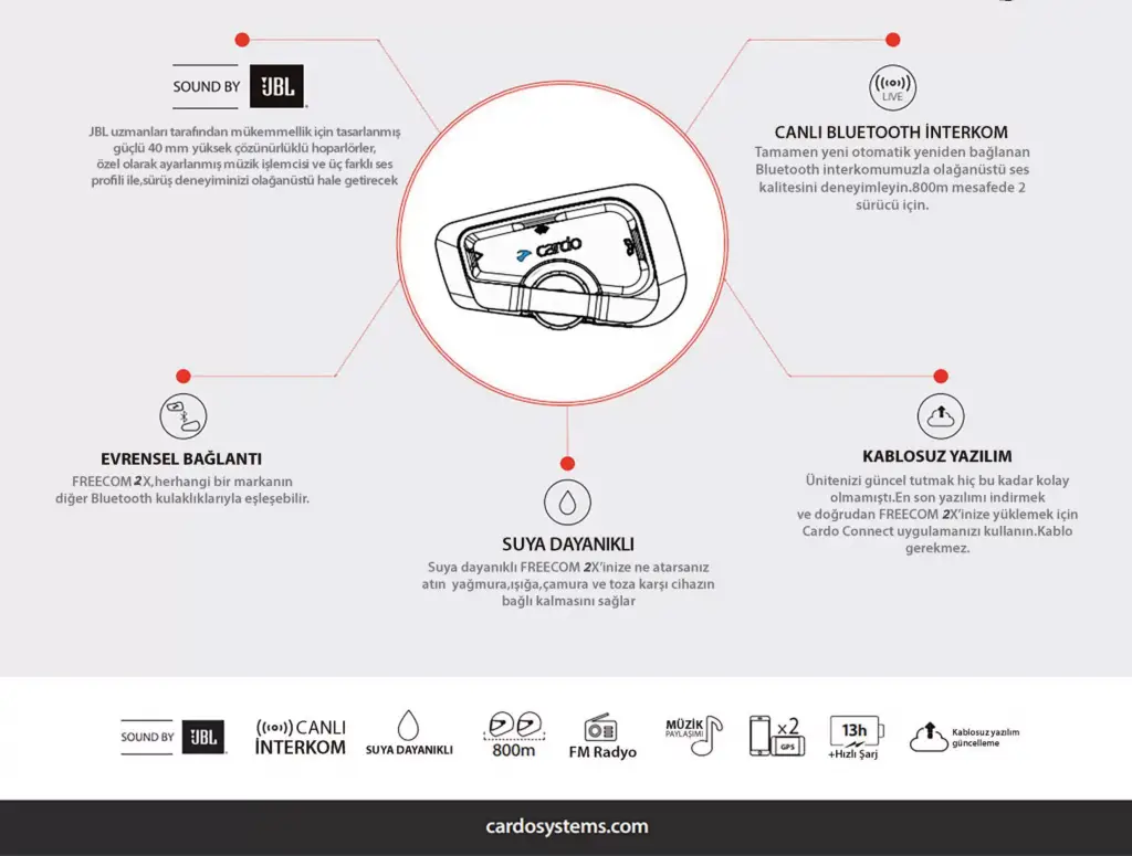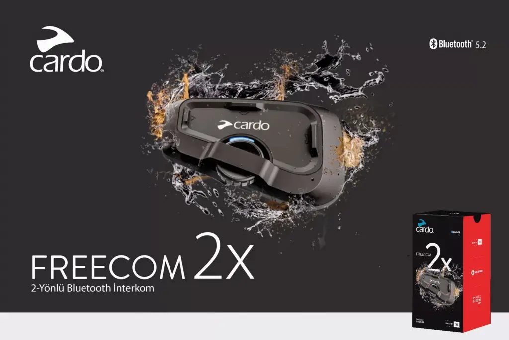 CARDO FREECOM 2X Tekli PaketDünyanın en iyi Bluetooth iletişim sistemi Premium ses, canlı interkom ve analog jog-dial özellikli 2 sürücü için en iyi Bluetooth iletişim cihazı Freecom 2x, üstün Bluetooth iletişim cihazları için yeni bir standart belirliyor. Sound by JBL ve en son Bluetooth teknolojisi ile donatılan Freecom 2x, daha önce hiç olmadığı kadar canlı sesle iki sürücü için otomatik olarak yeniden bağlanan bir Bluetooth bağlantısı olan Live Intercom'u sunar. Su geçirmez, jog-dial ve kablosuz yazılım güncellemeleri, zaten inanılmaz olan bu pakete ek değer sağlar.Özellikleri:• 2 biniciye kadar• 800m menzil• Canlı İnterkom (otomatik yeniden bağlanma, geniş bant ses)• 40 mm JBL hoparlörler ve JBL ses profilleri• Kontrol tekerleği• FM radyo• Hızlı şarj ile 13 saat konuşma süresi• Bluetooth 5.2 çipi• Su geçirmeye dayanıklı, iki yıl garanti• Evrensel bağlantı• Otomatik ses seviyesi• Kablosuz yazılım güncellemesi• 2 cihaz eşleştirme (Telefon/GPS)• Paralel sesle müzik akışı• USB tipi C• Çalışma Sıcaklığı: -20˚C ila 55˚C / -4˚F ila 131˚F• Su geçirmezUyumlu:• EvrenselFM radyo:• Çalışma frekansları 76-108MHz• RDS—Radyo Veri sistemleri• 6 ön ayarlı istasyon hafızasıYazılım Yükseltmeleri:• Havadan güncellemeler• USB kablosu güncellemeleriCihaz ayarları:• Cardo Connect uygulamasıBoyutlar ana ünite:• Yükseklik: 48mm• uzunluk: 78mm• Derinlik: 20mm• Ağırlık: 37gKonuşmacılar:• Çap: 40mm• Derinlik: 10mmBağlantı:• Cep telefonu ve GPS için 2 kanal• Bluetooth 5.2• Evrensel bağlantı• TFT bağlantısıinterkom:• Otomatik yeniden bağlanma, HD sesli Bluetooth interkom• Grup boyutu: 4 sürücüye kadar – Menzil: 1,2km / 0,75mi'ye kadarKullanıcı arayüzü:• Doğal ses çalışması• Çok dilli durum duyurularıSes:• JBL'den ses• 40 mm HD hoparlörler• HD Ses profilleri• Otomatik ses kontrolüPiller:• Konuşma süresi: 13 saat• Şarj Süresi: 2 saate kadarİçerik:• 1x Cardo Freecom 2x iletişim cihazı• 1 x Cardo hoparlör çifti• 1 x Cardo mikrofon• 1 x Cardo boynu mikrofon• Velcro pedleri dahilNot:Uygun olmayan voltaj değeri olan adaptörler ile cihazı şarj etmek, cihazın bataryasına veya elektronik devrelerine zarar verebilir. Bu durum, cihazın ömrünü kısaltabilir veya tamamen kullanılamaz hale getirebilir. 5v'luk adaptörler ile şarj edilmesi gerekmektedir.Yurtdışından alınan CARDO markalı ürünlere ülkemizde garanti ve servis hizmetleri verilememektedir.Ürün Kullanma Kılavuzuİndirmek için tıklayınız