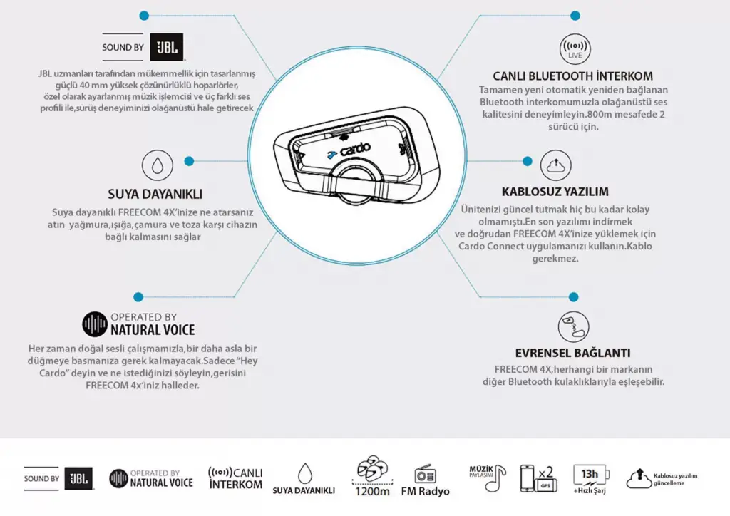 CARDO FREECOM 4X Tekli Paket Sound by JBL ile donatılmış ve sesli komut ile çalışan Freecom 4x, bir sürücünün istediği tüm özellikleri bir araya getirir. Dört sürücü için otomatik bağlanan bir Bluetooth bağlantısı olan ve daha önce hiç olmadığı kadar canlı sese sahip Live Intercom'u sunan Freecom 4x, her sürüş için ideal premium bir cihazdır.Özellikleri:• 4 sürücüye kadar, 1200m menzil• Canlı İnterkom (otomatik yeniden bağlanma, geniş bant ses)• Doğal ses çalışması• 40 mm JBL hoparlörler ve JBL ses profilleri• FM radyo• Hızlı şarj ile 13 saat konuşma süresi• Bluetooth 5.2 çipi• Su geçirmeye dayanıklı, iki yıl garanti• Evrensel bağlantı• Otomatik ses seviyesi• Kablosuz yazılım güncellemesi• Telefon / GPS için 2 kanal• Paralel sesle müzik yayınlama• USB tip CUyumlu:• EvrenselFM radyo:• Çalışma frekansları 76-108MHz• RDS - radyo veri sistemleri• 6 ön ayarlı hafızaYazılım yükseltmeleri:• Kablosuz güncelleme• USB kablosu ile güncellemeCihaz ayarları:• Cardo Connect uygulamasıAna ünite boyutları:• Yükseklik: 48mm• uzunluk: 78mm• Derinlik: 20mm• Ağırlık: 37gKonuşmacılar:• Çap: 40mm• Derinlik: 10mmBağlantı:• Cep telefonu ve GPS için 2 kanal• Bluetooth 5.2• Evrensel bağlantı• TFT bağlantısıinterkom:• Otomatik yeniden bağlanma, HD sesli bluetooth interkom• Grup boyutu: 4 sürücüye kadar• Menzil: 1,2 km / 0,75 mi'ye kadarKullanıcı arayüzü:• Doğal ses çalışması• Çok dilli durum raporlarıSes:• Sound by JBL• 40 mm HD hoparlörler• HD ses profilleri• Otomatik ses kontrolüPiller:• Konuşma süresi: 13 saat• Şarj süresi: 2 saate kadarDahil:• 1x Cardo Freecom 4x iletişim cihazı• 1 x Cardo hoparlörler• 1 x Cardo mikrofon• 1 x Cardo açık kask mikrofonu• Velcro pedleri dahilNot:Uygun olmayan voltaj değeri olan adaptörler ile cihazı şarj etmek, cihazın bataryasına veya elektronik devrelerine zarar verebilir. Bu durum, cihazın ömrünü kısaltabilir veya tamamen kullanılamaz hale getirebilir. 5v'luk adaptörler ile şarj edilmesi gerekmektedir.Yurtdışından alınan CARDO markalı ürünlere ülkemizde garanti ve servis hizmetleri verilememektedir.font color="red">Ürün Kullanma Kılavuzuİndirmek için tıklayınız