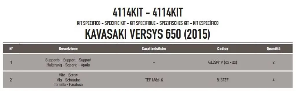 YAN ÇANTA TAŞIYICI BAĞLANTI KİTİModel: KAWASAKI VERSYS 650 (15-24)Ürün No : 4114KITUyumlu ÜRÜN : PLX4114 / PL4114 / TE4114ARKA ÇANTA TAKMADAN SADECE YAN ÇANTA TAKABİLMEK İÇİN BAĞLANTI KİTİ Ürün pdf dosyasını indirmek için tıklayınız