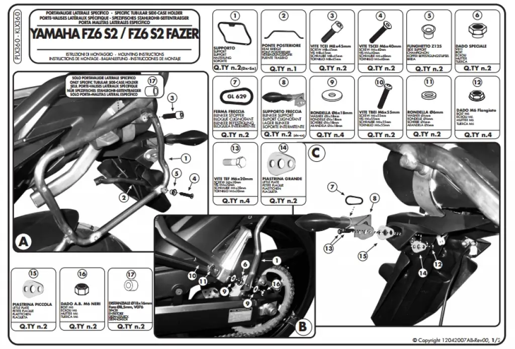 YAN ÇANTA TAŞIYICI Model: YAMAHA FZ6 S2 – FZ6 FAZER S2 (2007-2011)Ürün No : PLX360Bağlantı Şekli : DirektSADECE GIVI V35 ÇANTA İLE UYUMLUDUR.Not : Arka çanta taşıyıcınız yoksa 351KIT kullanılarak monte edilebilir. Arka çantanız varsa direk monte edilebilir. Ürün pdf dosyasını indirmek için tıklayınız