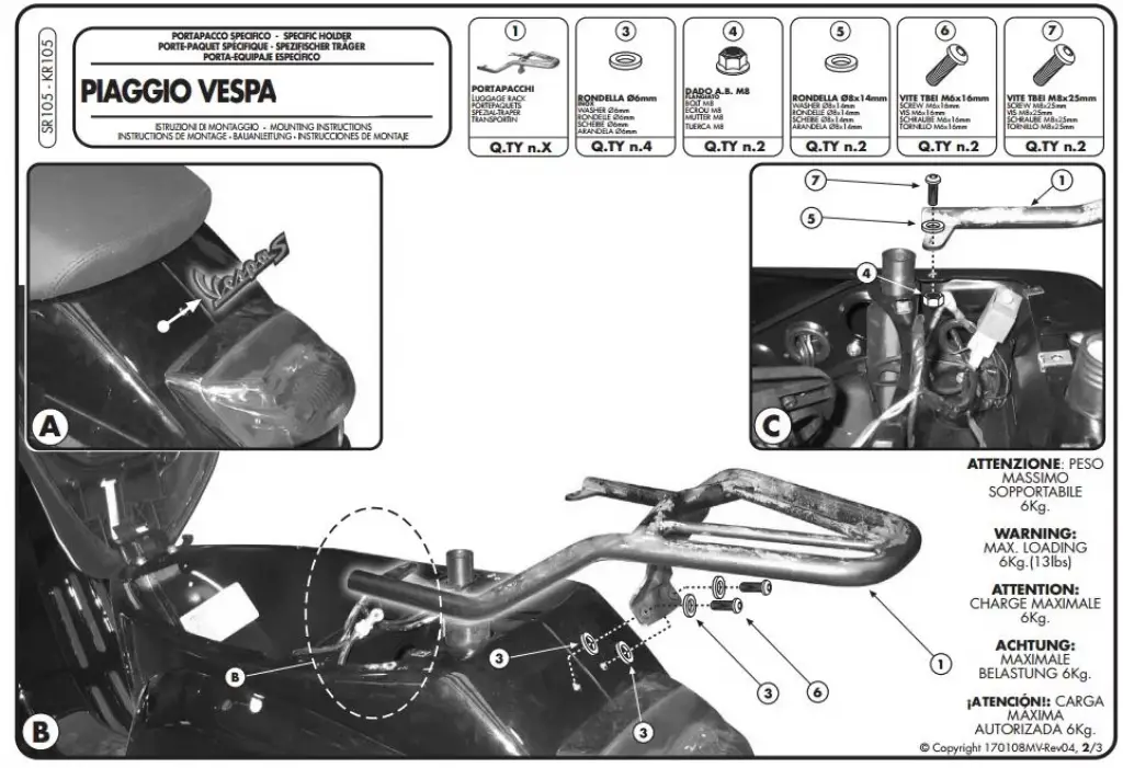ARKA ÇANTA TAŞIYICIModel: PIAGGIO VESPA LX 50-125-150 (05-14) S 50-125-150 (07-14)Ürün No : SR105 Bağlantı Şekli : DirektSistem : Monolock Ürün pdf dosyasını indirmek için tıklayınız