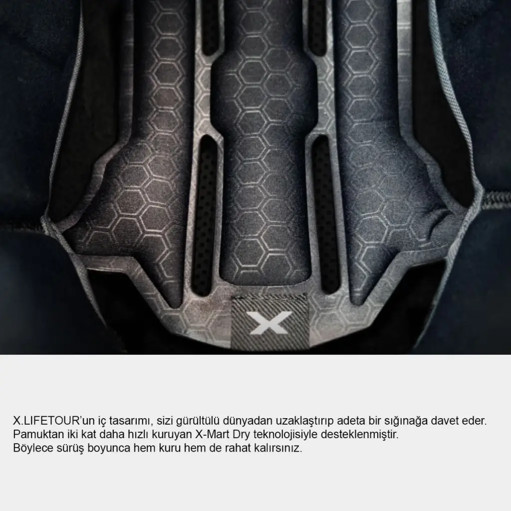[genel]GENEL• X.LIFETOUR'un kabuğu daha hafif, daha güçlü ve daha konforlu hale getiren kompozit bir yapı elde etmek için yeni nesil bir teknoloji olan ultra hafif, darbeye dayanıklı X-PRO Karbon fiberden yapılmıştır• 2 farklı kabuk yapısı (XS-L | XL-XXXL)• Aerodinamik yapı[havalandirma]HAVALANDIRMA• Çene havalandırması• Arka havalandırma• Geliştirilmiş havalandırma kanalları[vizor]VİZÖR• Kolay takılıp çıkarılabilen vizör sistemi• Pinlock takılabilen ve çizilmeye dayanıklı ön vizör• Geniş görüş açısı• Güneş vizörü[konfor]KONFOR• Çene açılır sistem• Komple sökülüp yıkanabilir özellikte iç ped sistemi,• Pamuklu kumaşlara göre çok daha hızlı kuruyabilen dolgulu X-MART DRY iç ped,• Acil durumlarda ilk yardım ekibine destek amaçlı geliştirilmiş kolay sökülebilir yanak ped sistemi• Metal mikrometrik bağlantı kayış tokası• Kask ile beraber geliştirilmiş Nexx X.COM 3 Bluetooth interkom modeliyle uyumlu,• Gece görünürlüğü artırıcı reflektörler• Aksiyon kamera desteği[sertifika]SERTİFİKA• ECE 22.06 sertifikası[kutu_icerigi]KUTU İÇERİĞİ• Taşıma kılıfı• Pinlock buhar camı• Çene altı rüzgar perdesi• Kamera montaj aparatı• Ek olarak siyah vizör kutu içerisinden çıkmaktadır