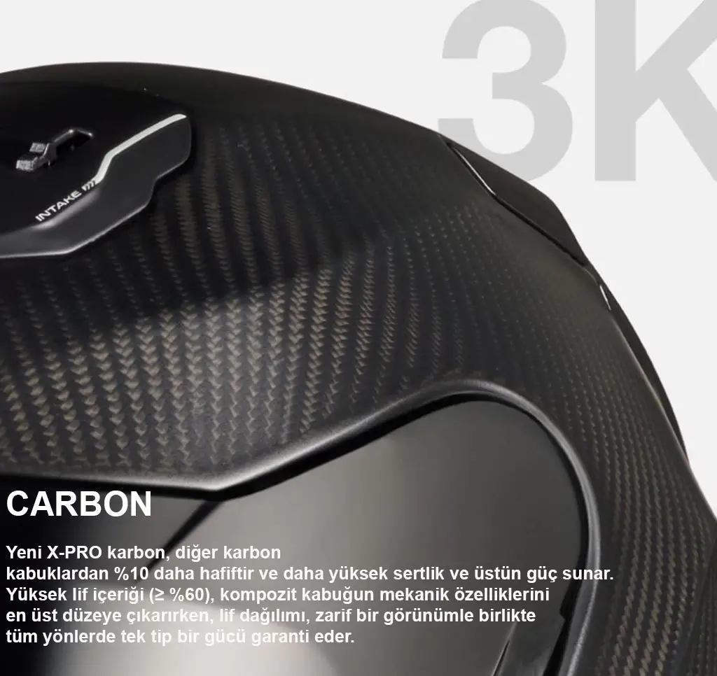 [genel] GENEL• 3 farklı kabuk yapısı ( xxs-s, m-l, xl-xxxl )• X-MATRIX 2 KABUK YAPISI(fiberglas,3D organik fiberler,özel aramit fiber katmanlar ve karbon güçlendirme)• X-PRO karbon özelliği ile diğer karbon kabuklardan %10 daha hafiftir ve daha yüksek sertlik ve üstün güç sunar• Özel aerodinamik yapı [havalandirma] HAVALANDIRMA• Dinamik hava sistemi• 6 adet havalandırma girişi• 4 adet havalandırma çıkışı• Arka kısımda aerodinamik yapı sağlayan spoiler [vizor] VİZÖR• Kolay takılıp çıkarılabilen vizör sistemi• Ses düzeyini minimuma indirebilmek adına vizörde çift katmanlı kauçuk yapı• Geniş görüş açısı• Titreşim önleyici özel kauçuk vizör plakaları, titreşimleri emecek ve nominal seviyelere eşit olarak dağıtacak şekilde tasarlanmıştır• Çift kilitli güvenlik sistemine sahip kırılmaz PC Lexan vizör [konfor]KONFOR• X-Lock mıknatıslı buton ile Double D-Ring kayış sistemi• Acil durumlarda kolayca çıkarılabilir iç pedler,• Çıkarılabilir kayış korumaları• Çıkarılabilir burunluk• Boyunlukta dahil olmak üzere tüm iç pedler çıkarılabilir, yıkanabilir ve normal pamuğa göre iki kat daha hızlı kuruma oranına sahip serin, kuru ve rahat kalmanıza yardımcı olan yumuşak dokunuşlu ve özel işlem görmüş X-Mart Dry teknolojisine sahiptir. [sertifika]SERTİFİKA• ECE 22.06 sertifikası• DOT Güvenlik sertifikası• NBR-7471:2001 sertifikası[kutu_icerigi]KUTU İÇERİĞİ• Taşıma kılıfı• Pinlock buhar camı• Ek olarak RENKLİ vizör kutu içerisinden çıkmaktadır