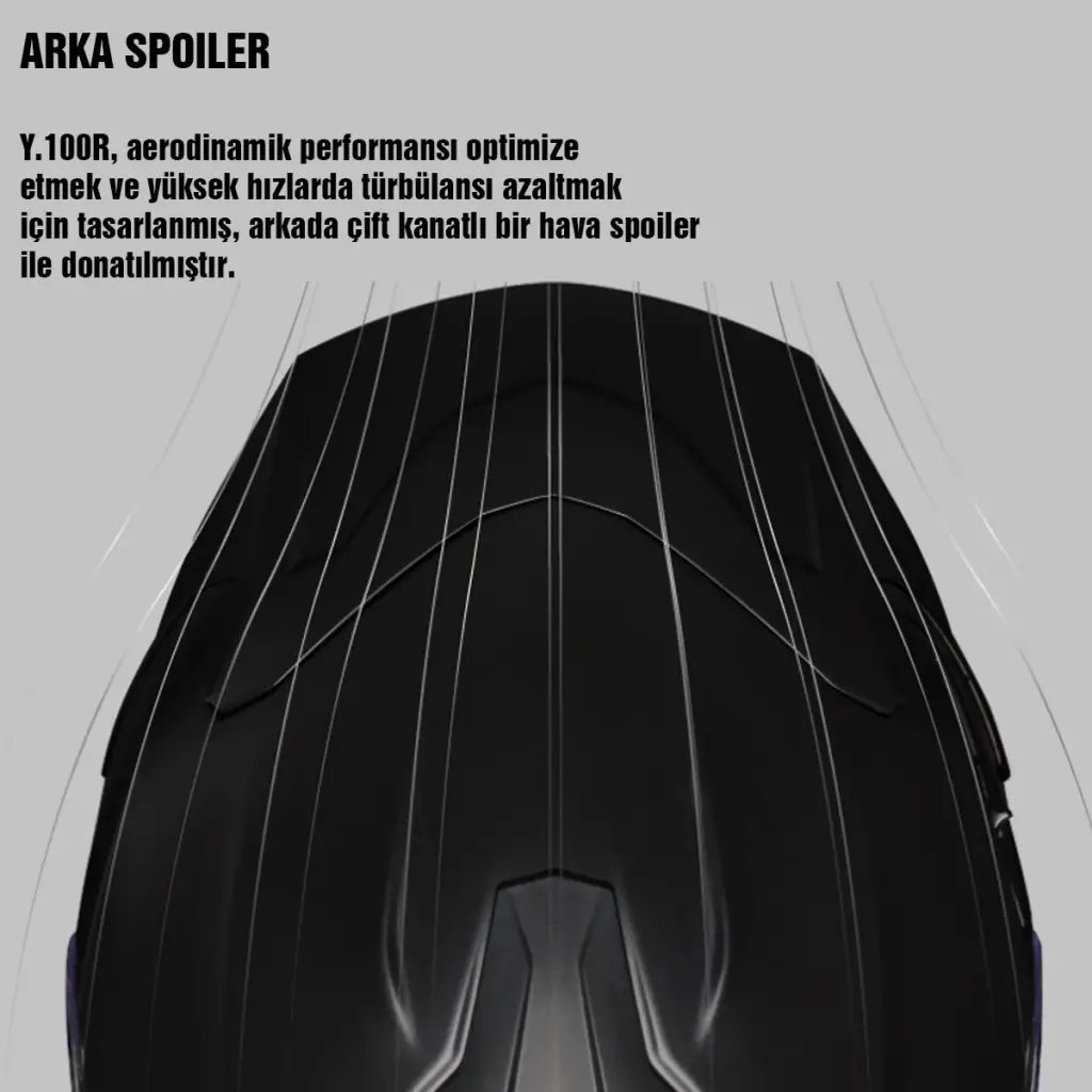 [genel] GENEL• Yüksek performanslı polifusion kabuk yapısı• 2 farklı kabuk yapısı (XS-M / L-XXL)• Geliştirilmiş aerodinamik yapı• Y.100R'ın özel şekli, yüksek hızda hem dengeyi hem de ses yalıtımını optimize eden sportif bir tasarıma sahiptir. [havalandirma] HAVALANDIRMA• Dinamik hava sistemi• Çene havalandırması• Ön ve arka havalandırma kanalları• Y.100R aerodinamik performansı optimize etmek ve yüksek hızlarda türbülansı azaltmak için tasarlanmış, arkada çift kanatlı bir hava spoilerı [vizor] VİZÖR• A sınıfı polikarbonat, UV filtreli ön vizör• X-swift mekanizmasıyla kolay sökülebilir ön vizör• Çizilmelere karşı dayanıklı dahili güneş vizörü [konfor]KONFOR• Komple sökülüp yıkanabilir yumuşak terletmeyen ped sistemi• Pamuklu kumaşlara göre çok daha hızlı kuruyabilen dolgulu X-MART DRY iç ped• Mikrometrik bağlantı kayış tokası• Bluetooth ve interkom kullanımı için hazır kulaklık yuvaları• Çene altı rüzgar perdesi• Hava dağıtıcı burunluk• Ağırlık: 1575g +/- 50g. [sertifika]SERTİFİKA• ECE 22.06 sertifikası[kutu_icerigi]KUTU İÇERİĞİ• Taşıma kılıfı• Pinlock 70 buhar cam• Çene altı rüzgar perdesi• Kamera aparatı