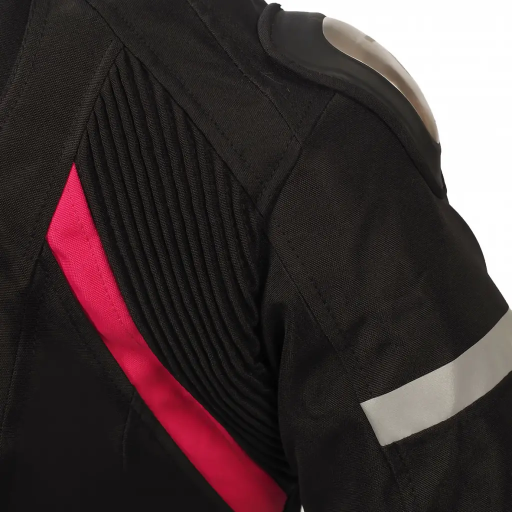 [kumas] MALZEME• Sürtünmeye dayanıklı polyester Duratex 600D kumaş• 4 Mevsim kullanılabilen bir modeldir• Spor motosiklet kullanıcıları için özel tasarım [koruma] KORUMA• CE Sertifikalı omuz korumaları• CE Sertifikalı dirsek korumaları• Omuz bölgeleri metal plaka ile extra güçlendirilmiş [ergonomi] ERGONOMİ• Güçlendirilmiş dikiş yapısı• Yüksek süratlerde aerodinamizm için hörgüç sistemi• Raylı yaka kapatma sistemi• Rahat kullanım için hafif kumaş yapısı• Gece görünürlüğü artırıcı reflektör logolar• Vücut ayar kayışları• Kol kısmında ayarlanabilir fermuar• Kol kısmında ayar kayışları• Kadınlara özel kesimdir[isi_dengesi]ISI VE ASTAR• Nefes alabilen yapı• Fermuarlı çıkarılabilir termal içlik• Su ve rüzgar geçirmeye dayanıklı[ozellikler] ÖZELLİK• 2 adet dış cep
