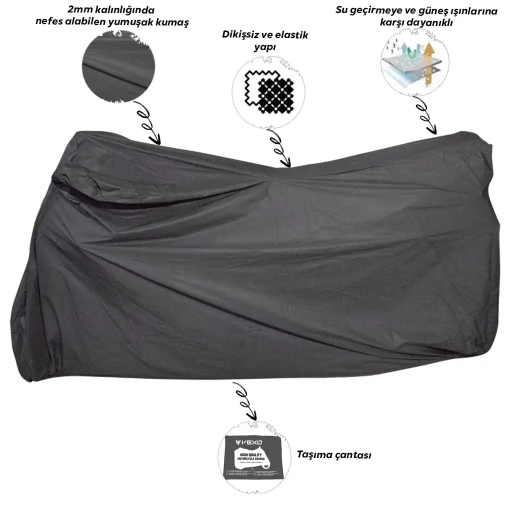 [kumas]MALZEME• 2mm kalınlığında miflonlu kumaş[havalandirma]ÖZELLİK• Su geçirmeye karşı dayanıklı• Güneş ışınlarına karşı dayanıklı• Dikişsiz ve elastik yapı • Saklama çantası ile birlikteEbatları:(Uzunluk x Genişlik x Yükseklik)• S: 205x85x123• M: 215x85x127• L: 225x90x140• XL: 270x95x130